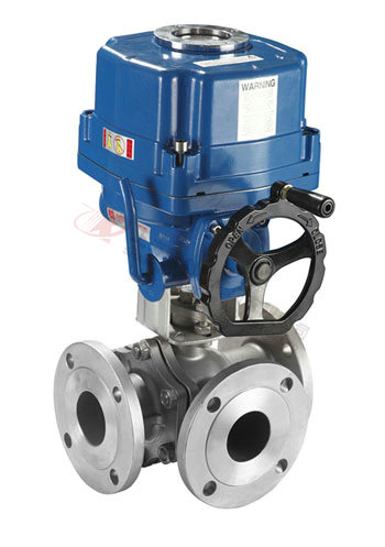 電動三通球閥分L型和T型,介質流通方向見下圖。L型電動三通球閥適用于介質流向的切換,能使相互垂直的兩個通道連通:T型電動三通球閥適用于介質的分流、合流或流向 切換,T型孔道可以使三個通道互相連通或使其中兩個通道連通,電動三通球閥一般采用三個閥座結構,亦可根據用戶要求采用四閥座結構。